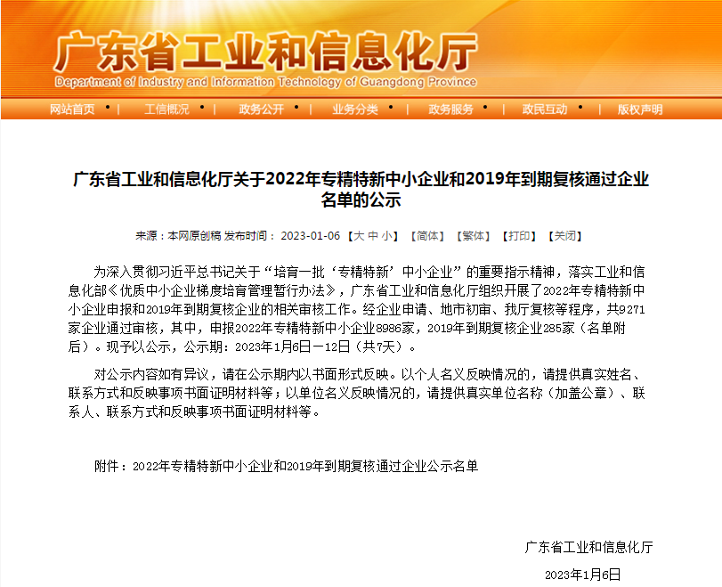 太阳成集团tyc138成功入选广东省2022年专精特新中小企业!