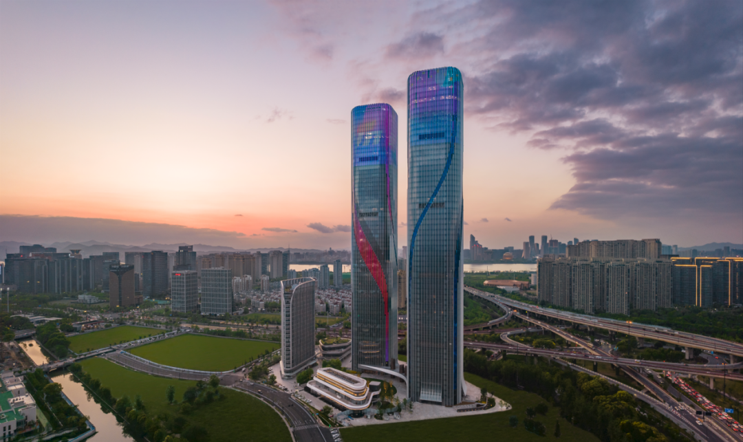 作为杭州“迎宾”地标之一的杭州智慧之门,与亚运主会场仅一桥之隔,整体由5栋建筑组成,两栋高度为280米的超高层建筑与多层配套辅楼互相呼应,是一座集办公、商务、商业、教育、生活休闲于一身的多业态、多功能标志性城市商务综合体。